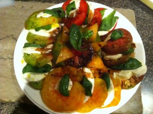 A Caprese Salad I made with fresh heirloom tomatoes, fresh buffalo mozzarella, and basil.