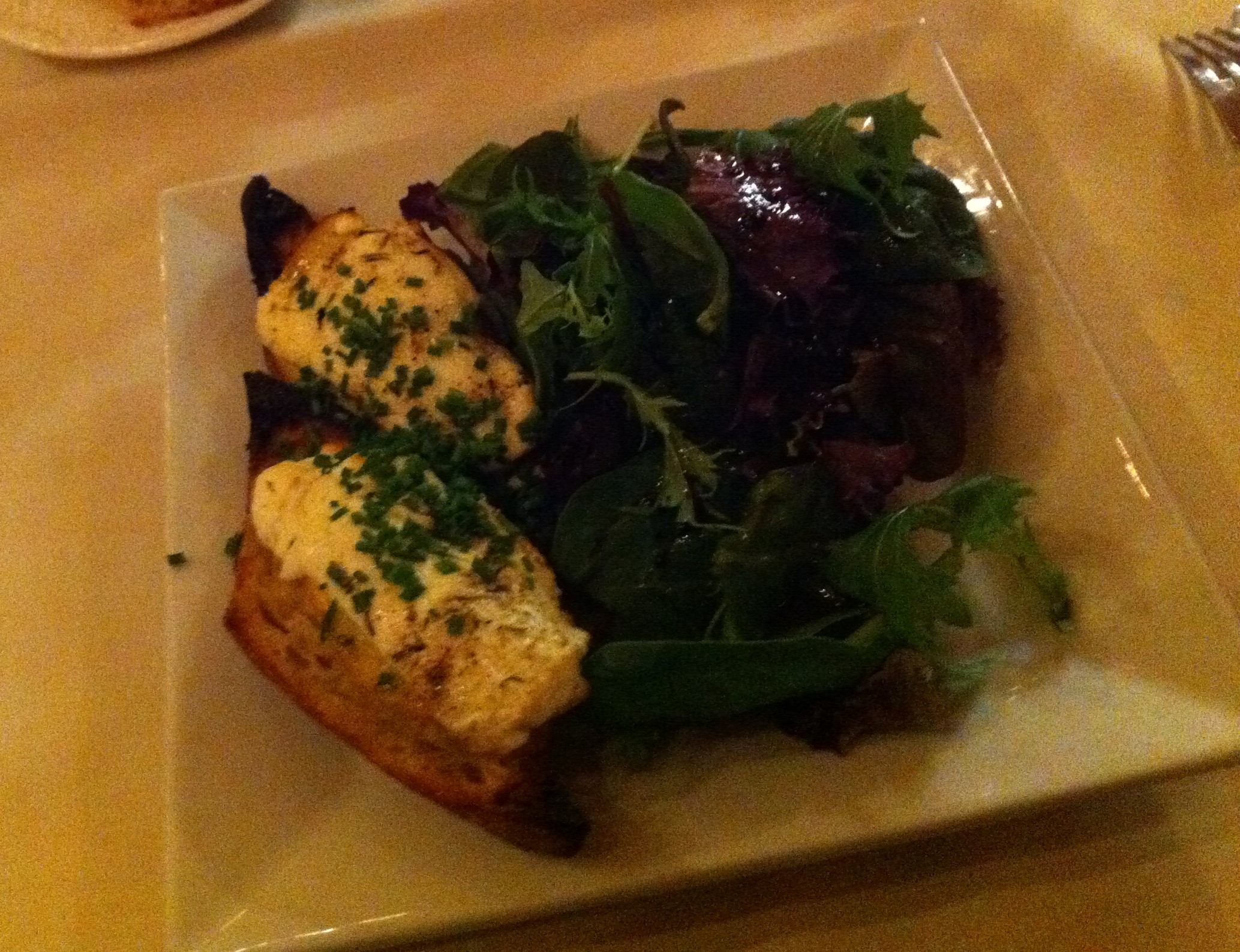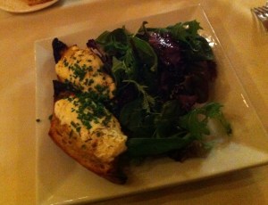 The first thing I do is unpack and… take a nap.  I’m exhausted from my trip.  Although the flight was very comfortable, I didn’t really sleep and so even though I’m thrilled to be here, I need some rest.  When I finally wake up, I’m starving.  Across the street from the apartment is Etamine Cafe.  A fantastic restaurant owned by Phillipe and Sylvan.  Kevin and Scott had told me about this place and are friends of the owners.  It’s a Saturday night and  the Cafe is very busy, Phillipe finds me a table dispute the crowd and I am ready for my first meal in Paris.  He gives me a menu and also displays the chalkboard with the Prix Fix menu which changes daily.  I go for the Prix Fix and start my meal with a Warm Goat Cheese Salad.  The goat cheese is a creamy texture, a bit lighter than I thought it would be, and is nestled atop toasted slices of baguette.  Mixed greens are beside the cheesy croutes dressed with a  balsamic vinegar dressing that makes my taste buds sing.  I detect some sweetness as I enjoy the goat cheese and discover thin slices of slightly sautéed apple between the bread and the cheese.  This quickly becomes my new favorite salad of all time and I can’t wait to try and recreate it myself.  Those who know me know that I tend to be a fast eater.  NOT tonight!  I’m taking my time and savoring every morsel.