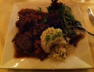 After the salad comes the Beouf Bourguignon.  A traditional Beef Stew cooked with red wine from the Burgundy region of France and perfect for a cold January night.  Although I’ve had this dish many times, and cooked it myself on several occasions, this experience is in Paris! And it is expertly prepared by Sylvan.  The beef is tender, the vegetables still have texture, and the  sauce is velvety.  Served with herbed rice that compliments the dish, I am in heaven as I eat my main course.  I catch my self making yummy noises as I eat and quickly look around the small dining room to see anyone is looking at me.  The I say to myself, who cares, I’m in Paris!!